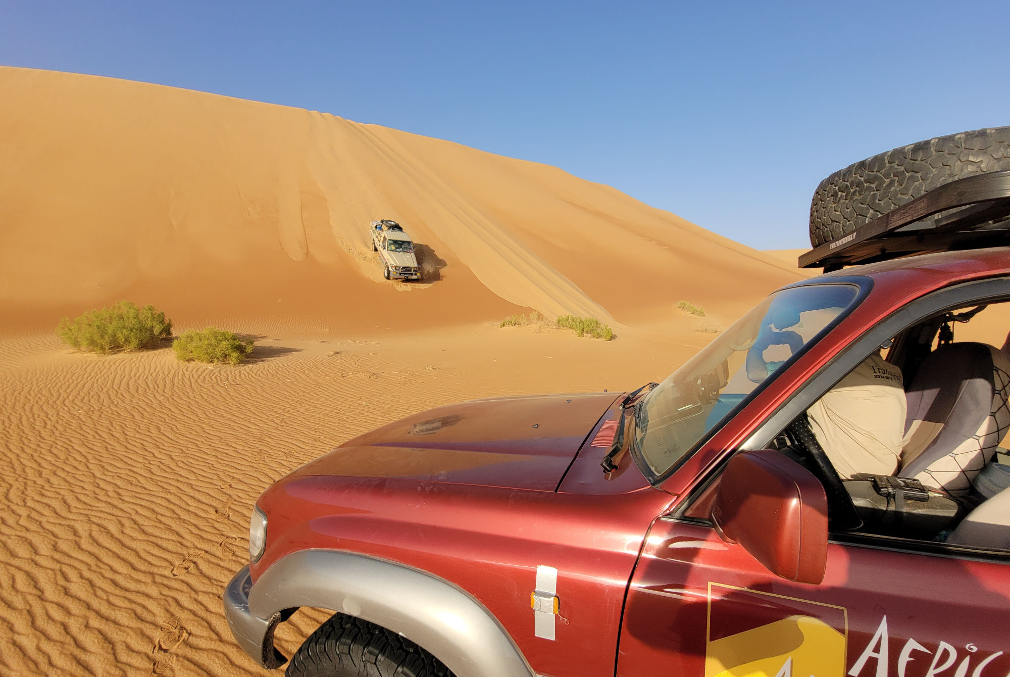 Siamo al centro del viaggio ci aspettano giorni grandiosi dove la solidarietà e l’affiatamento tra gli equipaggi sarà fondamentale per la riuscita della spedizione. Il paesaggio è molto vario, si viaggia dapprima attraverso dune ravvicinate e insidiose che ricordano un po’ quelle Tunisine e in seguito lungo cordoni più ampi. Anche il colore della sabbia cambia più volte, passando dall’arancione al giallo fino al bianco nei tratti finali. Vedremo parecchi pozzi di acqua ancora utilizzati. E' un deserto molto ricco anche dal punto di vista faunistico, con gazzelle, falchi e addirittura, nelle precedenti spedizioni, abbiamo avvistato uno stupendo gufo reale. Procedendo in direzione est ci troveremo a volte a superare ampie vallate ai cui bordi ci sono grandi falesie, sabbia molle e pietre nelle salite che dobbiamo affrontare per raggiungere le sommità. Al quinto giorno di attraversata arriveremo finalmente a Ghardaia. (4 campi, 1 hotel)